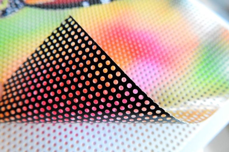 Material de excelente calidad ya que cuenta con perforaciones precisas que le permiten conseguir un efecto de transparencia del exterior. Con ello se obtiene una calidad inigualable de impresión, sin distorsiones ideales para una decoración vanguardista. Nuestros clientes lo utilizan para atraer la atención de la audiencia y potenciar las ventas.